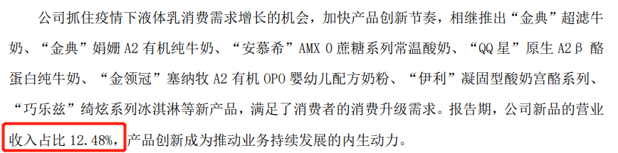 但從現(xiàn)階段來看,伊利的三大拳頭產(chǎn)品——伊利純牛奶、金典純牛奶和安慕希常溫酸奶營收規(guī)模均超200億,而近兩年推出的一系列高端化新品,收入占比只有12.48%,因此即便新品價(jià)格更高、增速更快,但短期內(nèi)想要在份額上超越老品并不容易。