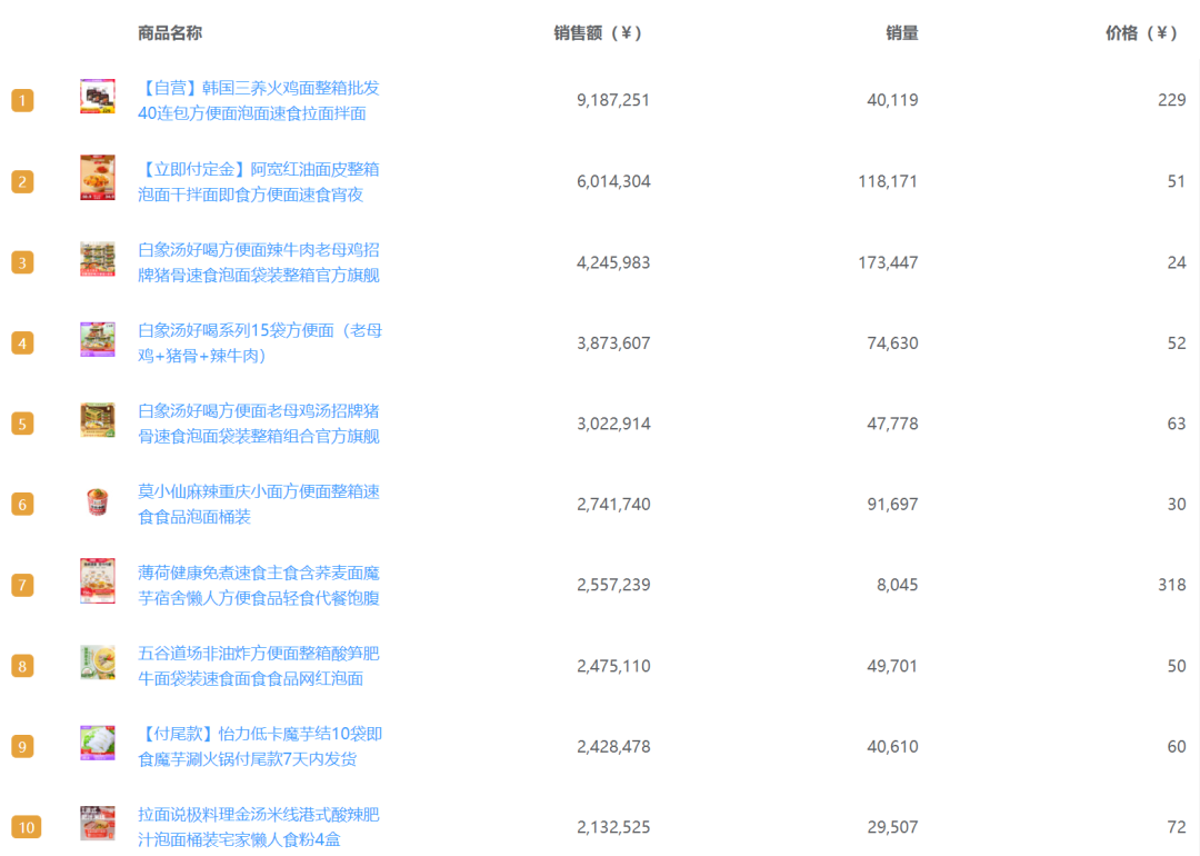 魔鏡市場(chǎng)情報(bào)2022年雙11天貓沖泡方便面/拉面/面皮類目商品排行榜