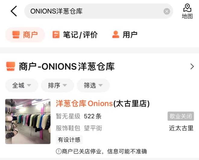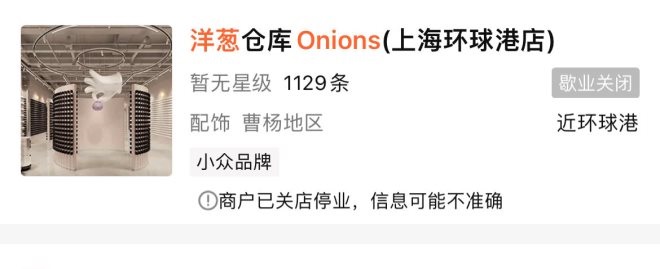 在大眾點評上,洋蔥倉庫上海環(huán)球港店以及成都太古里店均顯示閉店歇業(yè),這也是自2020年成立以來,洋蔥倉庫開出的唯二線下門店,如今均已“查無此店”。