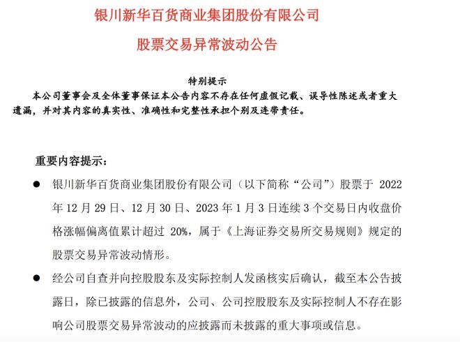 公告顯示,新華百貨股票于2022年12月29日、12月30日、2023年1月3日連續(xù)3個交易日內(nèi)收盤價格漲幅偏離值累計超過20%。