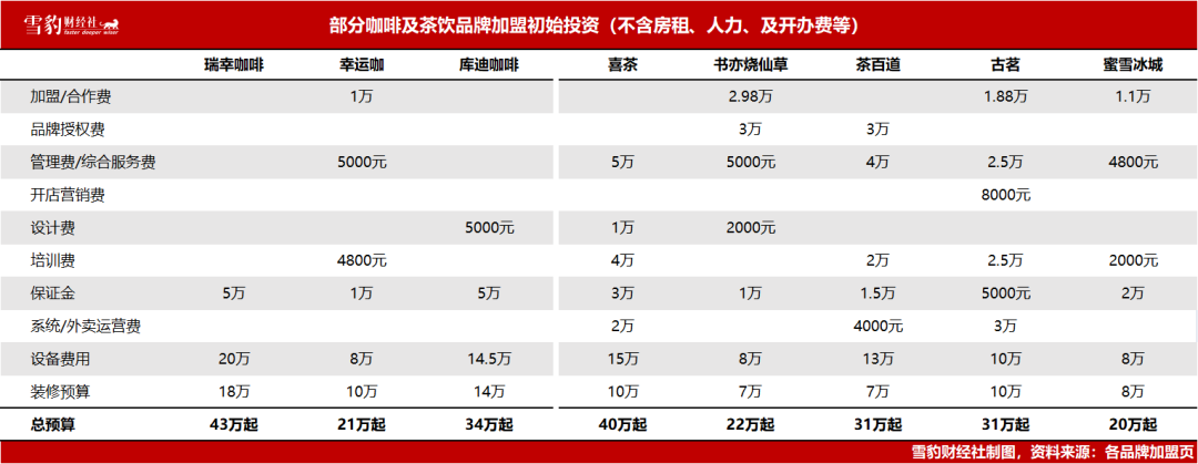 雪豹財(cái)經(jīng)社對比發(fā)現(xiàn),和奶茶品牌相比,瑞幸的初始投入主要貴在裝修和設(shè)備費(fèi)用。三四線城市奶茶店的面積通常是二三十平方米,裝修成本1500元/平米,遠(yuǎn)低于瑞幸的18萬元。設(shè)備方面,咖啡店的成本是連鎖奶茶品牌的2~3倍。