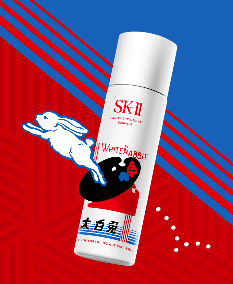 繼圣誕節(jié)紅綠包裝配色引起許多關(guān)注和熱度之后,SK-II又緊鑼密鼓推兔年限定——與老牌國貨大白兔聯(lián)名,推出限定款神仙水,外包裝讓人一下就聯(lián)想到大白兔奶糖。