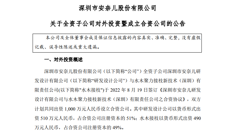 2022年8月22日,安奈兒披露,公司全資子公司深圳市安奈兒研發(fā)設(shè)計(jì)有限公司與水木聚力接枝新技術(shù)(深圳)有限責(zé)任公司約定共同設(shè)立合資公司,從事電子束接枝技術(shù)在抗病毒抗菌面料領(lǐng)域的商業(yè)應(yīng)用。