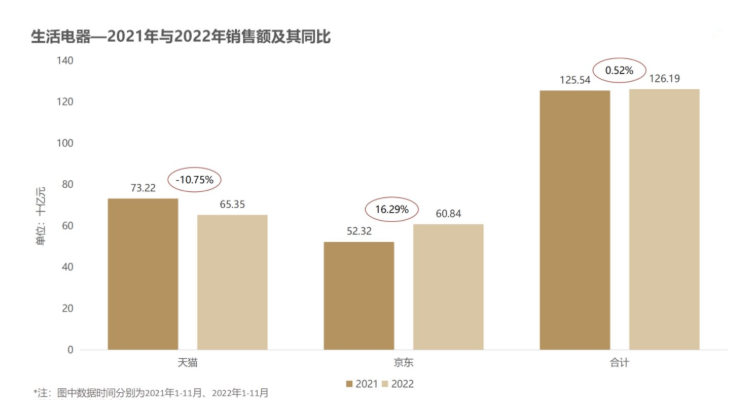 而從2022年來看,京東的這種優(yōu)勢仍在保持。據(jù)久謙中臺數(shù)據(jù)顯示,去年1-11月份,國內(nèi)生活電器總體呈小幅度增長,其中京東平臺增速明顯,達16.29%;但天貓平臺卻呈現(xiàn)下滑趨勢。