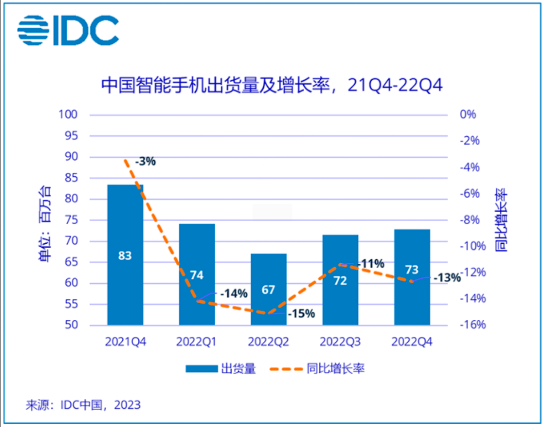 據(jù)IDC手機(jī)季度跟蹤報(bào)告顯示,2022年第四季度,中國智能手機(jī)市場出貨量約7,292萬臺,同比下降12.6%。2022年中國智能手機(jī)市場出貨量約2.86億臺,同比下降13.2%。