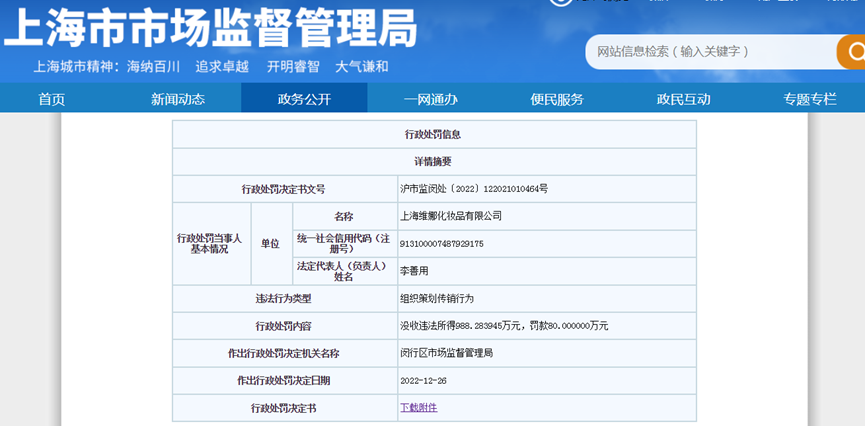 據(jù)公開的行政處罰信息顯示,2022年12月26日,上海維娜因存在組織策劃傳銷行為,被上海市閔行區(qū)市場監(jiān)督管理局沒收違法所得988萬元,并處罰金80萬元,罰沒款合計高達(dá)1068萬元。不過,目前相關(guān)行政處罰決定書具體內(nèi)容暫未公開。就此,青眼號外分別致電閔行區(qū)市監(jiān)局和上海維娜了解情況,但截至發(fā)稿未獲回復(fù)。