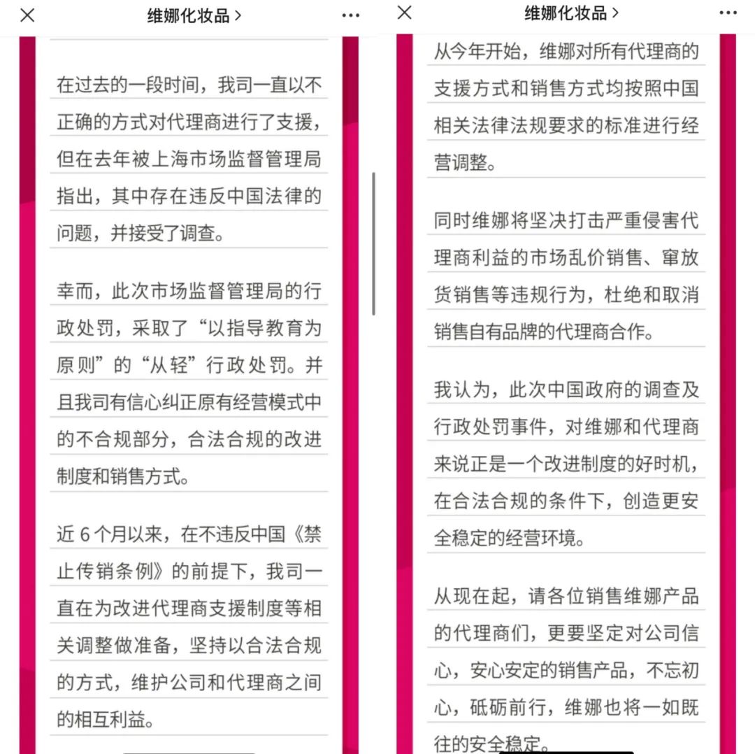 值得一提的是,2月9日上海維娜通過微信公眾號維娜化妝品發(fā)文稱,在過去一段時間其以不正確的方式對代理商進(jìn)行了支援,但在去年被上海市場監(jiān)督管理局指出其中存在違反中國法律的問題!敖6個月來,在不違反《中國禁止傳銷條例》的前提下,我司一直在為改進(jìn)代理商支援制度等調(diào)整做準(zhǔn)備,堅持以合法合規(guī)的方式,維護(hù)公司和代理商之間的相互利益!鄙虾>S娜在文章中表示。