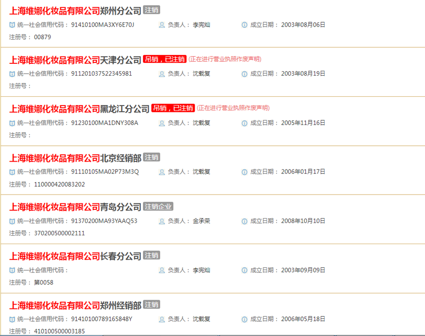 公開資料顯示,上海維娜成立于2003年04月16日,公司法定代表人為李善用,由維娜香港有限公司全資持股,經(jīng)營范圍包括化妝品批發(fā)、化妝品零售、食品銷售、化妝品生產(chǎn)等。據(jù)了解,該公司目前仍處于存續(xù)狀態(tài)。