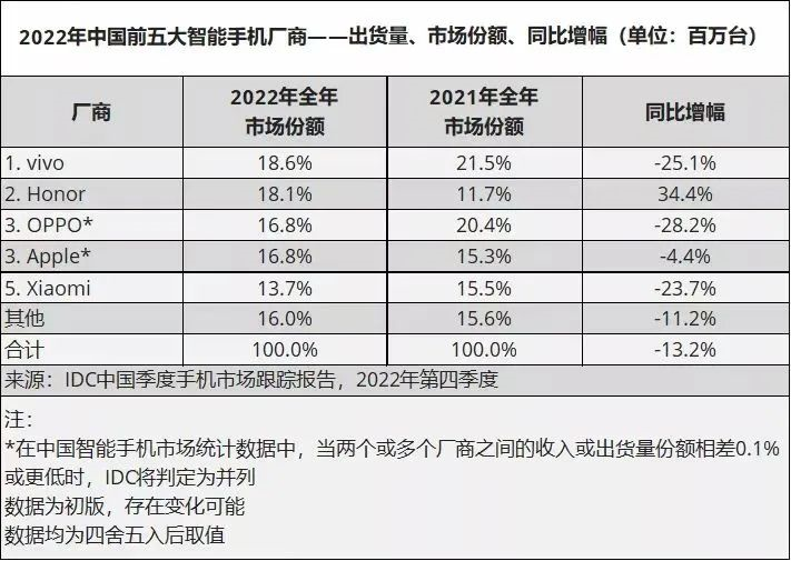 IDC最新發(fā)布數(shù)據(jù)顯示,2022年中國智能手機市場出貨量時隔10年再次回落到3億以下,同比下降13.2%至2.86億臺。