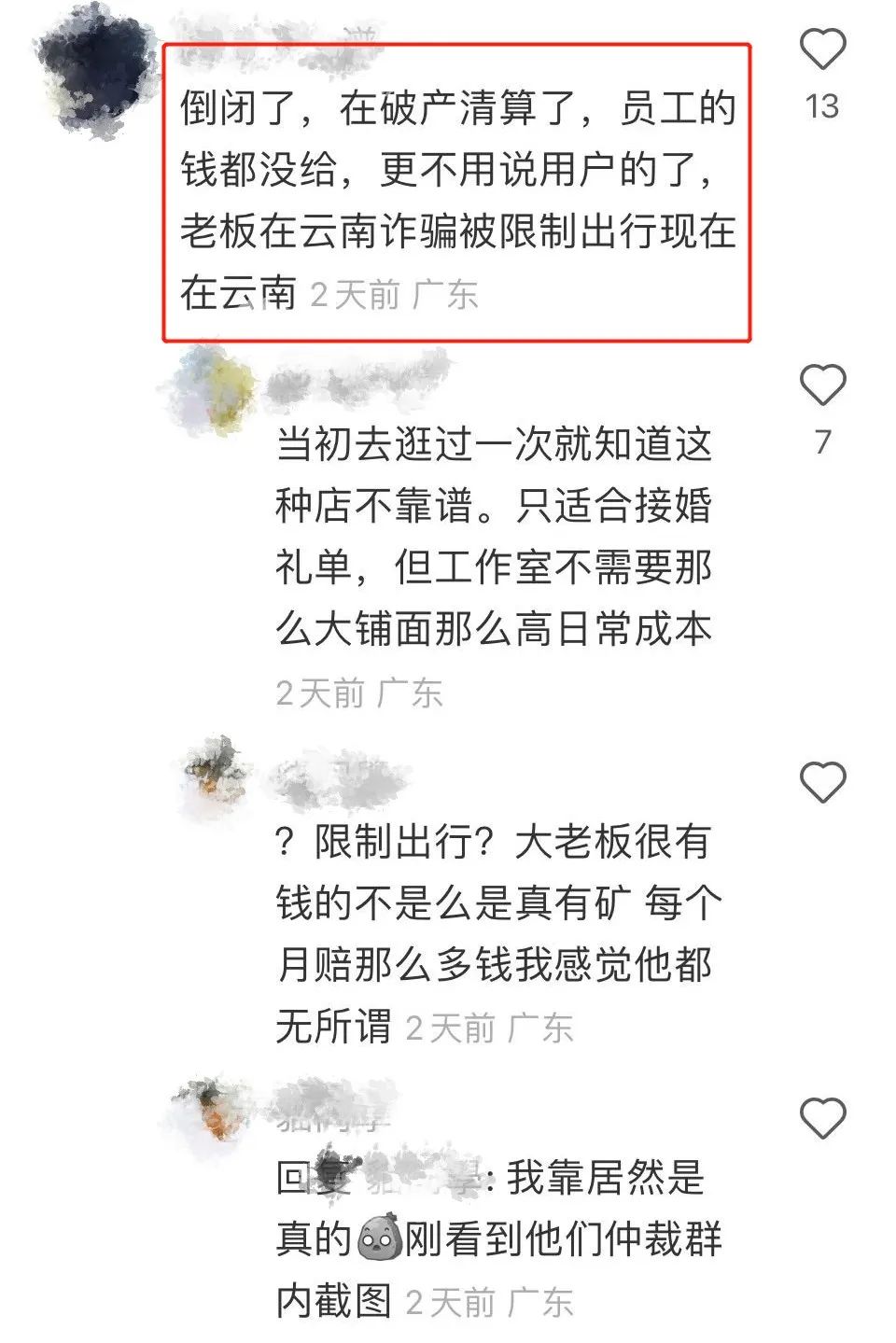 有留言回復表示,“倒閉了,在破產(chǎn)清算,員工的錢都沒給,更不用說用戶的了,老板在云南詐騙被限制出行...”