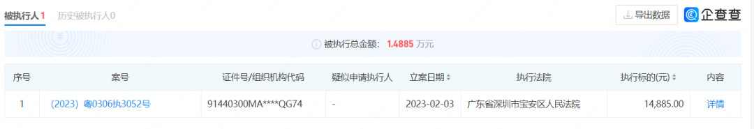 根據(jù)企查查顯示,昂司(深圳)食品有限公司在今年2月3日被立案,已經(jīng)成為被執(zhí)行人,被執(zhí)行總金額為1.4885萬。