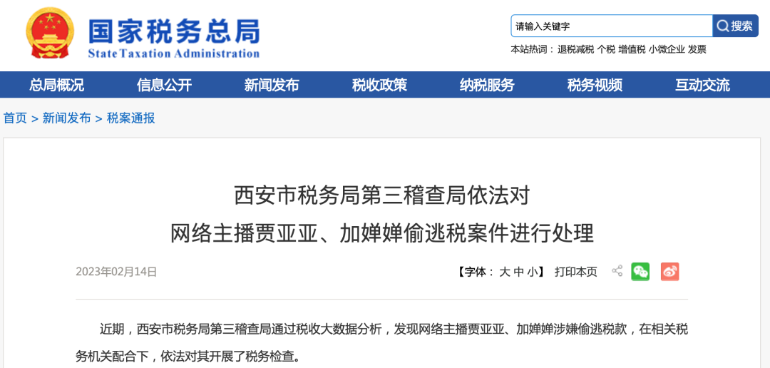 2月14日,國家稅務(wù)總局發(fā)布通告稱,西安稅務(wù)局近期對(duì)兩名網(wǎng)絡(luò)主播賈亞亞、加?jì)葖韧堤佣愖鞒鎏幜P。哪怕這兩位主播并不知名,但作為今年首起針對(duì)網(wǎng)絡(luò)主播的稅務(wù)處罰案件,實(shí)則傳遞出小主播查稅潮已然開始。