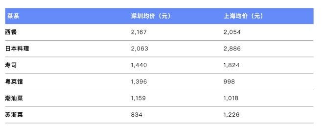 盤點發(fā)現(xiàn),在國外菜系中,日料整體均價深圳低于上海,而西餐高于上海,菜系價格與所處城市并無明顯相關(guān)性。