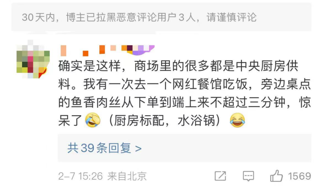 “確實是這樣,商場里的很多都是中央廚房供料。我有一次去一個網(wǎng)紅餐廳吃飯,旁邊桌點的魚香肉絲從下單到端上來不超過三分鐘,驚呆了!