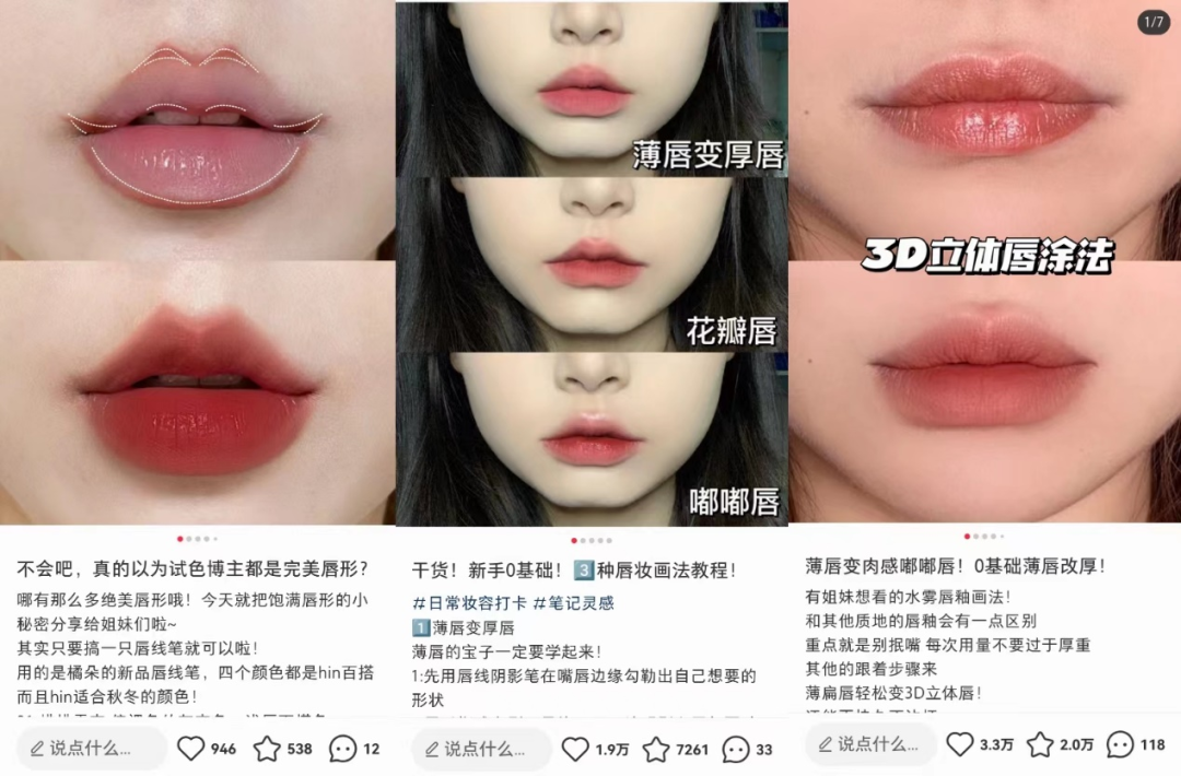 這股流行風(fēng)潮也吹向了國內(nèi)。更加自由、自信的新一代Z世代消費(fèi)者,并沒有一味追捧櫻桃小嘴,健康與元?dú)獠攀撬麄兊闹饕非。對于厚嘴唇,社媒上的妝教重點(diǎn)從“厚唇改善”轉(zhuǎn)向“畫出厚唇”,而薄嘴唇的唇妝也流行往外畫。