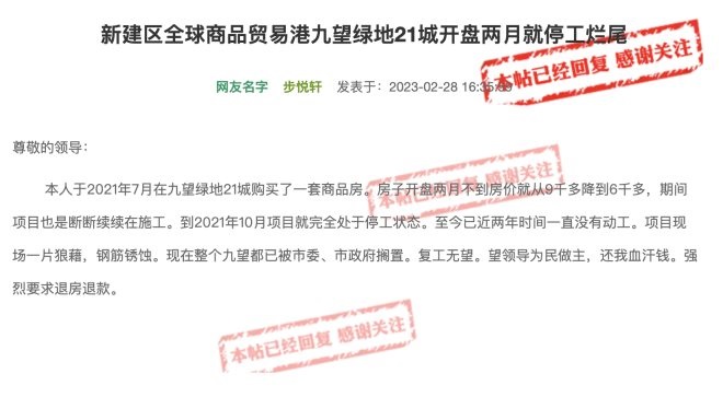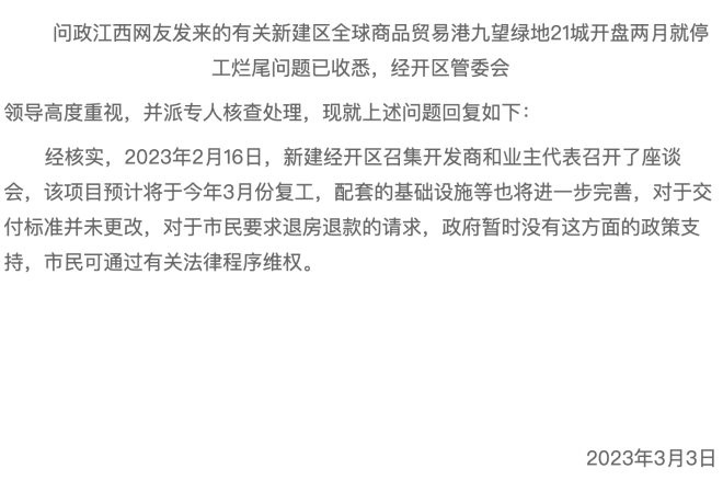 針對網(wǎng)友的疑問,相關(guān)政府部門回復(fù)稱,項(xiàng)目計(jì)劃將于今年3月份復(fù)工。