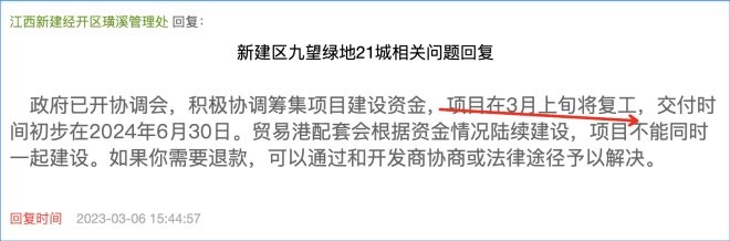 隨后項(xiàng)目方也回復(fù)稱,3月上旬將復(fù)工,交付時間初步定在2024年6月30日。