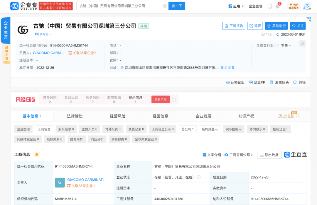 據(jù)企查查顯示,去年12月26日,古馳(中國)貿(mào)易有限公司深圳南山第三公司成立。