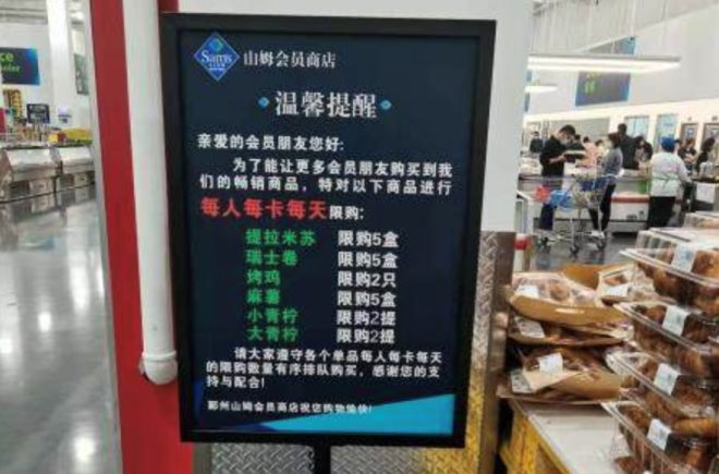 據(jù)媒體報(bào)道,寧波一山姆會(huì)員店就曾在商品貨架邊陳列了提示立牌:針對(duì)部分暢銷(xiāo)商品,每人每卡每天僅限購(gòu)提拉米蘇、瑞士卷、麻薯各五盒;烤雞兩只;大、小青檸各兩提。