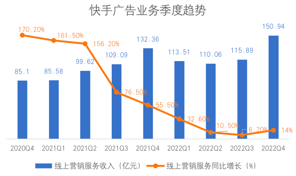 營(yíng)收占比53.4%的線上營(yíng)銷服務(wù),依然是快手核心業(yè)務(wù)和最大收入來(lái)源,2022Q4同比增長(zhǎng)14%,創(chuàng)下近三個(gè)季度以來(lái)的增速新高,超越彭博市場(chǎng)一致預(yù)期的9.5%。快手廣告業(yè)務(wù)同比增長(zhǎng)14%,業(yè)內(nèi)來(lái)看,低于騰訊Q4的15%,而騰訊是開(kāi)啟視頻號(hào)商業(yè)化才取得這樣的增長(zhǎng)。