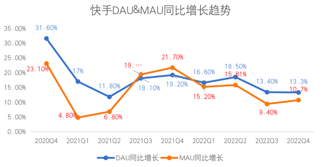 2022Q4,快手流量繼續(xù)擴(kuò)張,DAU和MAU分別為6.4億和3.66億,同比增長(zhǎng)13.3%和10.7%,好于2022Q3,但是,環(huán)比增長(zhǎng)僅0.8%和2.2%,流量增長(zhǎng)天花板趨近。
