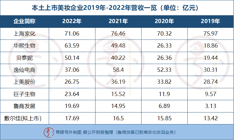 截至目前,上海家化、華熙生物、貝泰妮、魯商發(fā)展、逸仙電商、上美股份、巨子生物、敷爾佳等本土美妝企業(yè)已陸續(xù)交出去年的成績單。相較去年,上述8家企業(yè)的整體營收僅同比增長1.9億,而去年的數(shù)據(jù)約為63.92億,增幅縮水明顯。