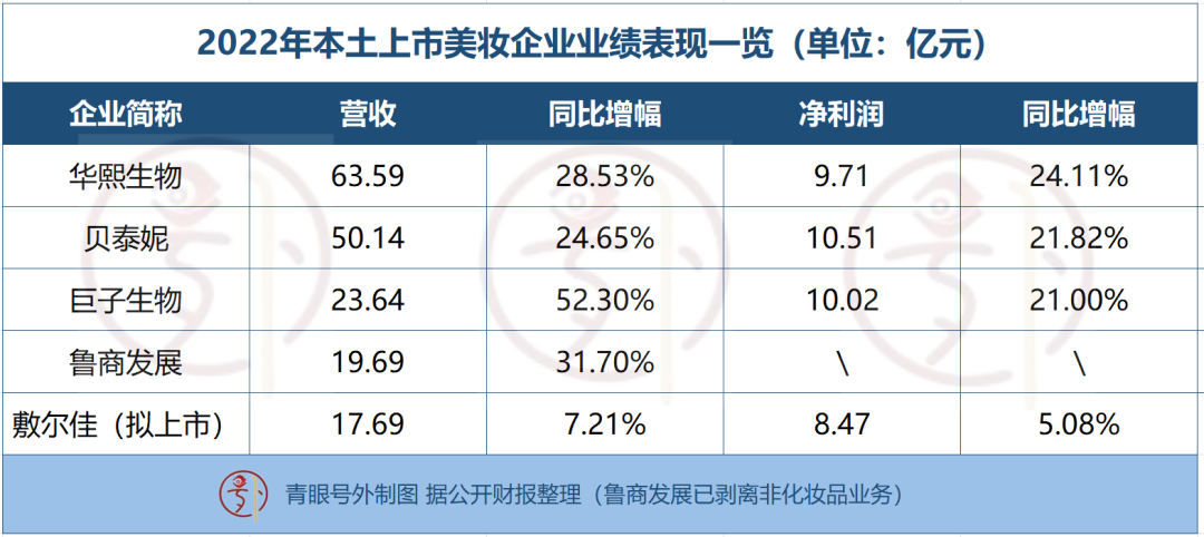 與此同時,一眾上市美妝企業(yè)格局也發(fā)生了不小的變化。譬如,華熙生物、貝泰妮昂首挺進(jìn)“50億”俱樂部,巨子生物、魯商發(fā)展、敷爾佳則均創(chuàng)得業(yè)績新高。另在品牌端,有多個成立時間較短的國貨美妝品牌在不確定的大環(huán)境下逆勢增長,全年銷售額突破10億大關(guān),一舉沖向20億美妝陣營。