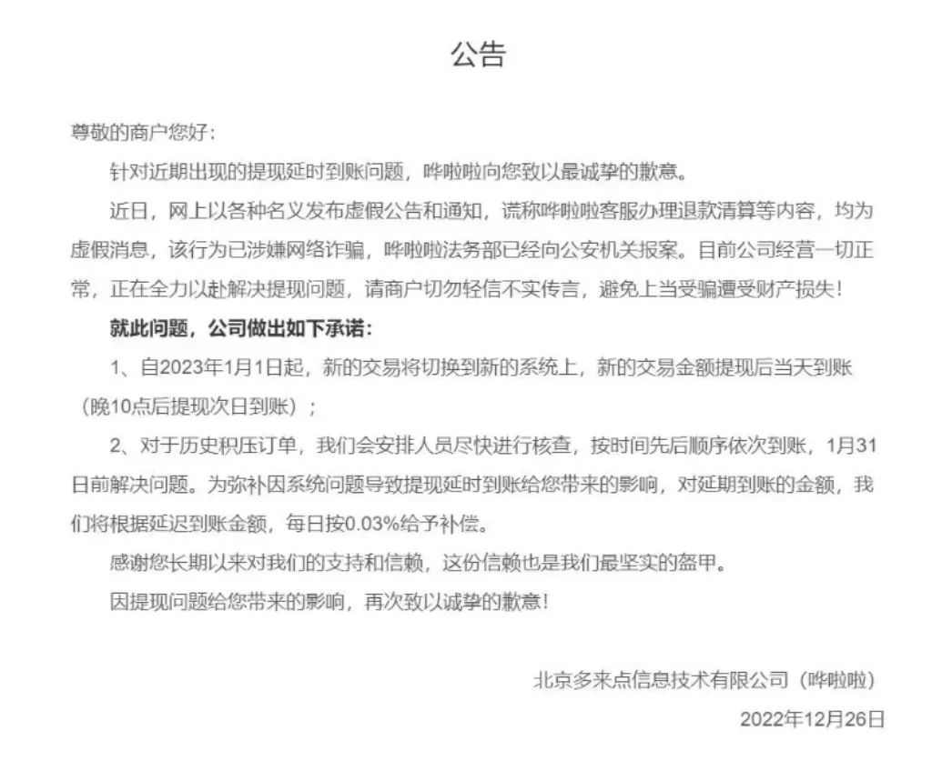 而在新的公告里,嘩啦啦又將提現(xiàn)延遲的理由歸結(jié)為“由于技術(shù)故障及流程等原因還需進(jìn)一步修復(fù) ”。并且再一次作出承諾,稱“歷史交易提現(xiàn)延時到賬問題預(yù)計(jì)將在2023年3月31日前全部解決。”