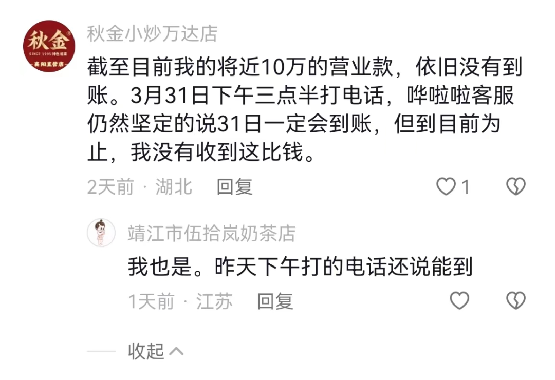 一些餐飲老板開始在維權(quán)群,社交平臺上發(fā)表對嘩啦啦的不滿,稱“去年12月份的到現(xiàn)在還沒到賬,房租都要交不起了”。