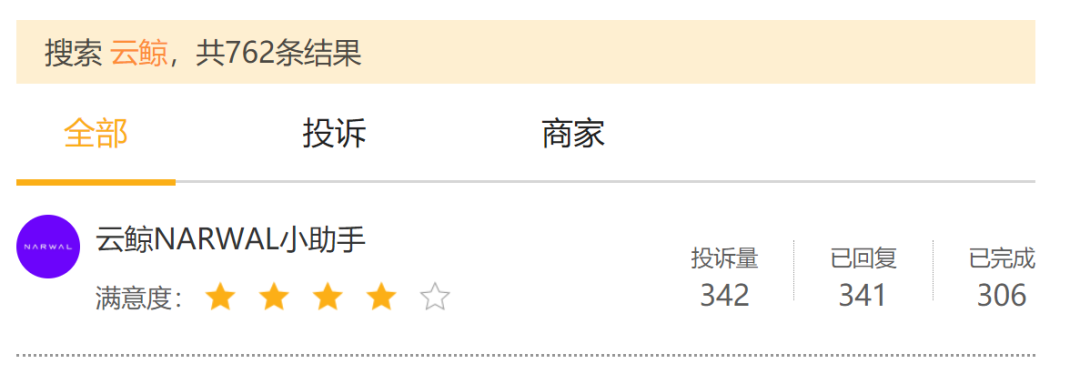 據(jù)黑貓投訴平臺(tái)的信息顯示,云鯨的投訴量為342條,涉及基站溢水、污水箱不抽水、充不進(jìn)電、多次返廠維修、清水桶漏水、上下水系統(tǒng)堵塞等問(wèn)題。