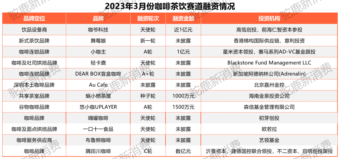 以上數(shù)據(jù)不難看出,在2023年第一季度,隨著消費(fèi)市場的快速復(fù)蘇,零售渠道銷售收入的快速增長,資本市場對(duì)于這一賽道投資意愿也較為積極。相較于2023年1月和2月,咖啡茶飲賽道在本月突然異軍突起,單月有12家相關(guān)企業(yè)獲得融資。其中僅有2家為新茶飲品牌,剩下10家是咖啡連鎖相關(guān)品牌。值得一提的是,10家獲得融資的咖啡相關(guān)企業(yè)中,有2家是咖啡及烘焙品牌獲得天使輪融資。