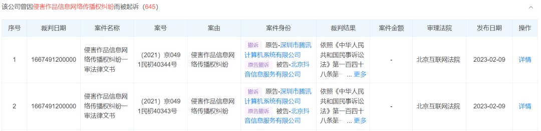 未來雙方的合作會走向何方尚未可知,但可預見的是,騰訊視頻和抖音都少了一樁煩心事。有意思的是,燃次元通過天眼查查詢得知,在2月9日,騰訊撤下了兩起針對抖音“侵害作品信息網(wǎng)絡傳播權(quán)糾紛”的起訴。