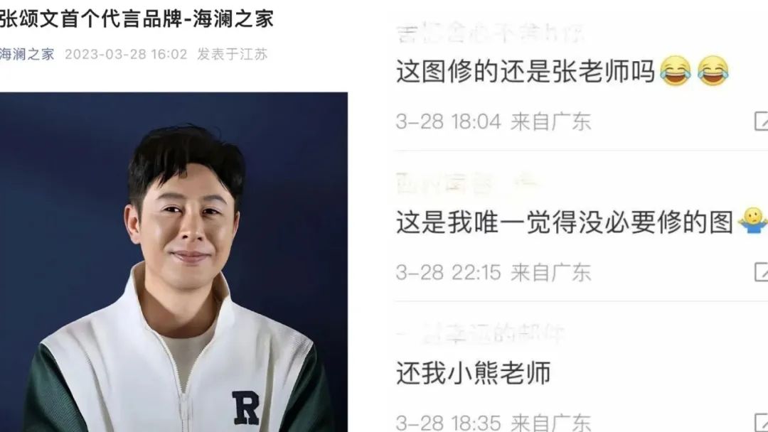 終于, 3月28日,海瀾之家在官微宣布拿到了張頌文的“首個(gè)代言”。本以為可以人氣銷量雙豐收,誰知代言海報(bào)卻被網(wǎng)友罵上了熱搜,“過度P圖像蠟像”、“挪用路演圖”、“吃相難看”等質(zhì)疑愈演愈烈。