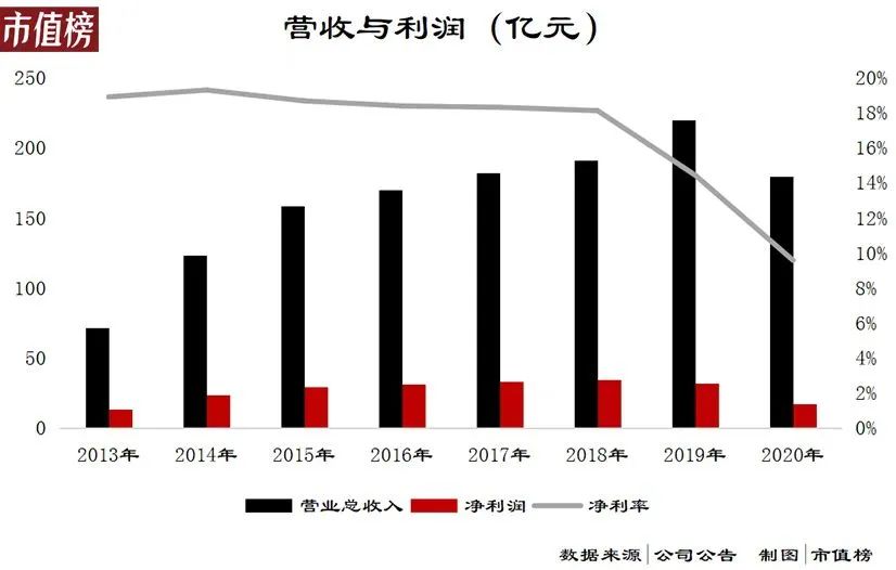 2020年年底,海瀾集團(tuán)迎來了新轉(zhuǎn)折,創(chuàng)始人周建平辭去董事長(zhǎng)位置,正式交棒兒子周立宸;2021年4月,海瀾之家披露了自上市以來最低的年報(bào)盈利,受疫情沖擊,公司在2020年實(shí)現(xiàn)營(yíng)業(yè)收入179.6億元,較2019年減少了18.3%,歸母凈利潤(rùn)才17.8億元,同比大跌44.4%。
