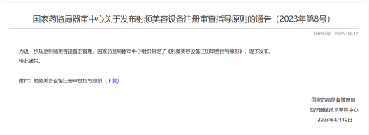 最近,國家藥品監(jiān)督管理局醫(yī)療器械技術(shù)審評中心發(fā)布《射頻美容設(shè)備注冊審查指導(dǎo)原則》(下文簡稱《指導(dǎo)原則》),對射頻美容設(shè)備產(chǎn)品注冊要點做了詳細說明。同時,《指導(dǎo)原則》內(nèi)容中明確規(guī)定,自2024年4月1日起,射頻治療儀、射頻皮膚治療儀之類產(chǎn)品未依法取得醫(yī)療器械注冊證不得生產(chǎn)、進口和銷售。