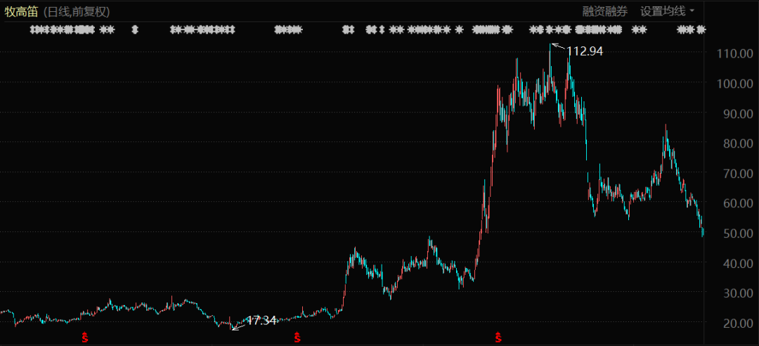 在2019年年末,牧高笛的股價為23.22元,對應(yīng)市值16.65億元。而到了露營最為火爆的2021和2022年,牧高笛股價開始躥升,最高超過110元,市值超過70億元,漲幅超過370%。