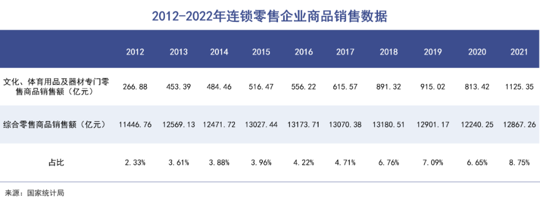 根據(jù)國家統(tǒng)計局數(shù)據(jù)顯示,從2012年到2021年的十年間,連鎖零售企業(yè)商品銷售數(shù)據(jù)中,文化、體育用品及器材專門零售商品銷售額從266.88億元增長到1125.35億元,增長超過300%。占綜合零售商品銷售額的比例從2.33%增長至8.75%。