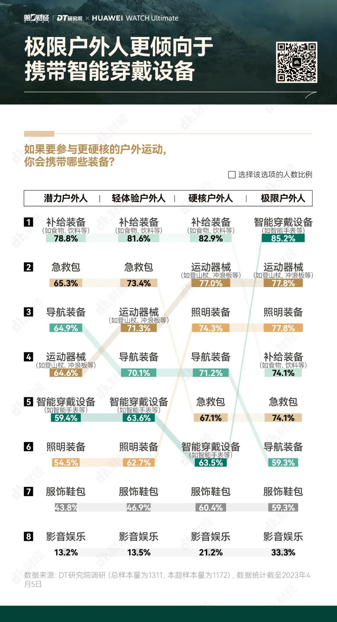 為了幫助大家更好地享受戶外運(yùn)動(dòng)的樂趣,勇敢出發(fā),安全回家,第一財(cái)經(jīng)旗下DT研究院聯(lián)合華為WATCH Ultimate 非凡大師推出《無畏前行:2023戶外運(yùn)動(dòng)報(bào)告》,我們?cè)噲D呈現(xiàn)的,不僅是“戶外運(yùn)動(dòng)走向硬核”的洞察,也是一份有專業(yè)依托、有經(jīng)驗(yàn)參考的戶外運(yùn)動(dòng)指南。