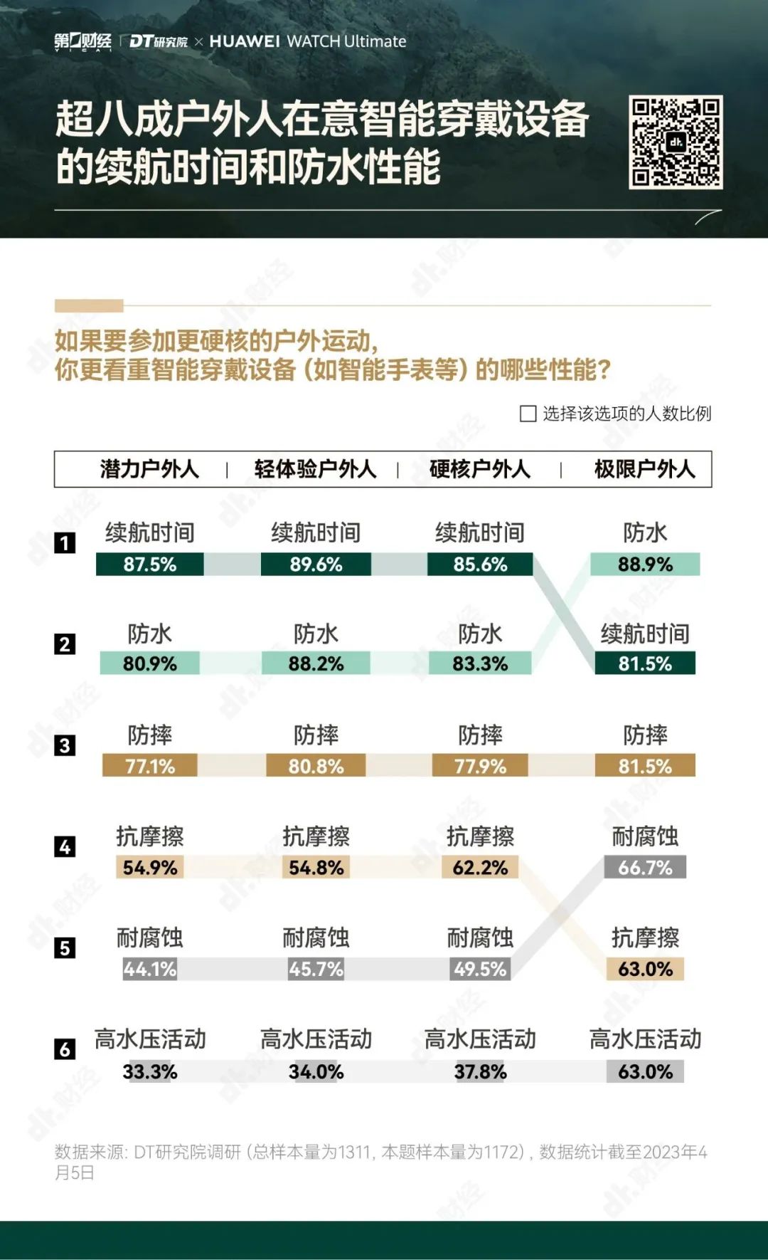 從性能來看,人們普遍最在意智能穿戴設(shè)備的“續(xù)航”和“防水”。這不僅是出于希望設(shè)備性能更優(yōu)的要求,也是因?yàn)槔m(xù)航和防水是能夠保障設(shè)備正常運(yùn)轉(zhuǎn)的最基礎(chǔ)條件,如果設(shè)備無法正常使用,在戶外就可能遇到風(fēng)險(xiǎn)。