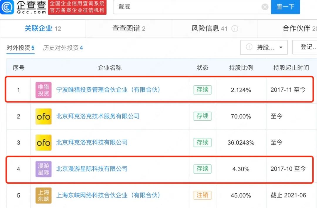 公開信息顯示,ofo創(chuàng)始人戴威名下12家企業(yè)中7家為存續(xù)狀態(tài),其中北京拜克洛克科技有限公司、北京拜克洛克技術(shù)服務(wù)有限公司、拜克洛克(天津)融資租賃有限公司、拜克洛克(天津)商業(yè)保理有限公司、上海奧佛合盛網(wǎng)絡(luò)科技有限公司5家為ofo關(guān)聯(lián)公司。7家存續(xù)狀態(tài)的企業(yè)中,戴威擔(dān)任2家企業(yè)的法定代表人,在4家企業(yè)中擔(dān)任董事長、執(zhí)行董事、經(jīng)理等。除持有北京拜克洛克科技有限公司、北京拜克洛克技術(shù)服務(wù)有限公司股份外,戴威還在寧波唯獵投資管理合伙企業(yè)(有限合伙)、北京漫游星際科技有限公司中分別持股2.12%、4.3%。