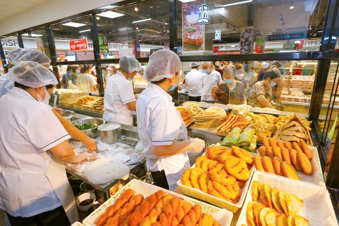 依托家家悅?cè)蛑辈傻墓⿷?yīng)鏈體系,精選來自世界各地的上千種進(jìn)口商品,包括各種進(jìn)口零食、紅酒、水果等,讓消費者盡享“買世界、品世界”的體驗。還有來自中國海鮮之都威海的各種海產(chǎn)品,以及帝王蟹、珍寶蟹、波士頓龍蝦等世界各地海產(chǎn),通過全程冷鏈系統(tǒng)直達(dá)門店。發(fā)揮自建生鮮加工中心和中央廚房聯(lián)動優(yōu)勢,圍繞消費者一日三餐需求,精選切配食材、速凍面食、畜禽水產(chǎn)、熟食加工、糕點等預(yù)制菜系列產(chǎn)品,從居民的菜籃子到菜盤子,除了膠東花餑餑、鲅魚水餃等膠東特色美食,還有北京消費者熟悉的京糕、驢打滾等京味糕點;在保證質(zhì)量的同時,滿足家庭生活社會化需求,真正實現(xiàn)“小家庭、大廚房”。