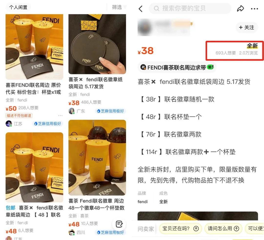 根據(jù)喜茶門店的規(guī)則,購買兩杯聯(lián)名奶茶就能獲得杯墊或隨機徽章,需要花38元。而在閑魚上接近700人點了“想要”的價格是:38元剛好能買到一個徽章,如果要全套(兩款聯(lián)名徽章+一個杯墊),需要118元拿下。