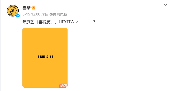 第二天,喜茶公布自己的年度色為“喜悅黃”,預告即將和某品牌聯(lián)名,16號揭曉。
