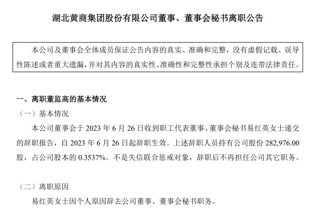聯(lián)商快訊:6月27日,黃商股份發(fā)布高管人事變動(dòng)公告,易紅英因個(gè)人原因辭去公司董事、董事會(huì)秘書(shū)職務(wù)。