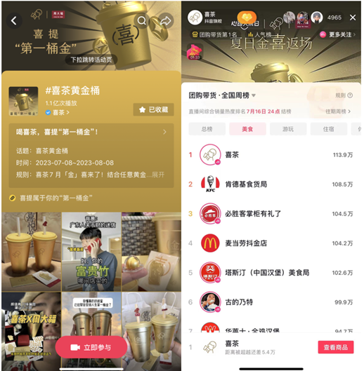 截至活動(dòng)結(jié)束,聯(lián)合抽獎(jiǎng)活動(dòng)總參與人數(shù)突破百萬,喜茶登上抖音團(tuán)購(gòu)帶貨周榜茶飲品牌top1,抖音#喜茶黃金桶#產(chǎn)品話題相關(guān)視頻播放量破億。