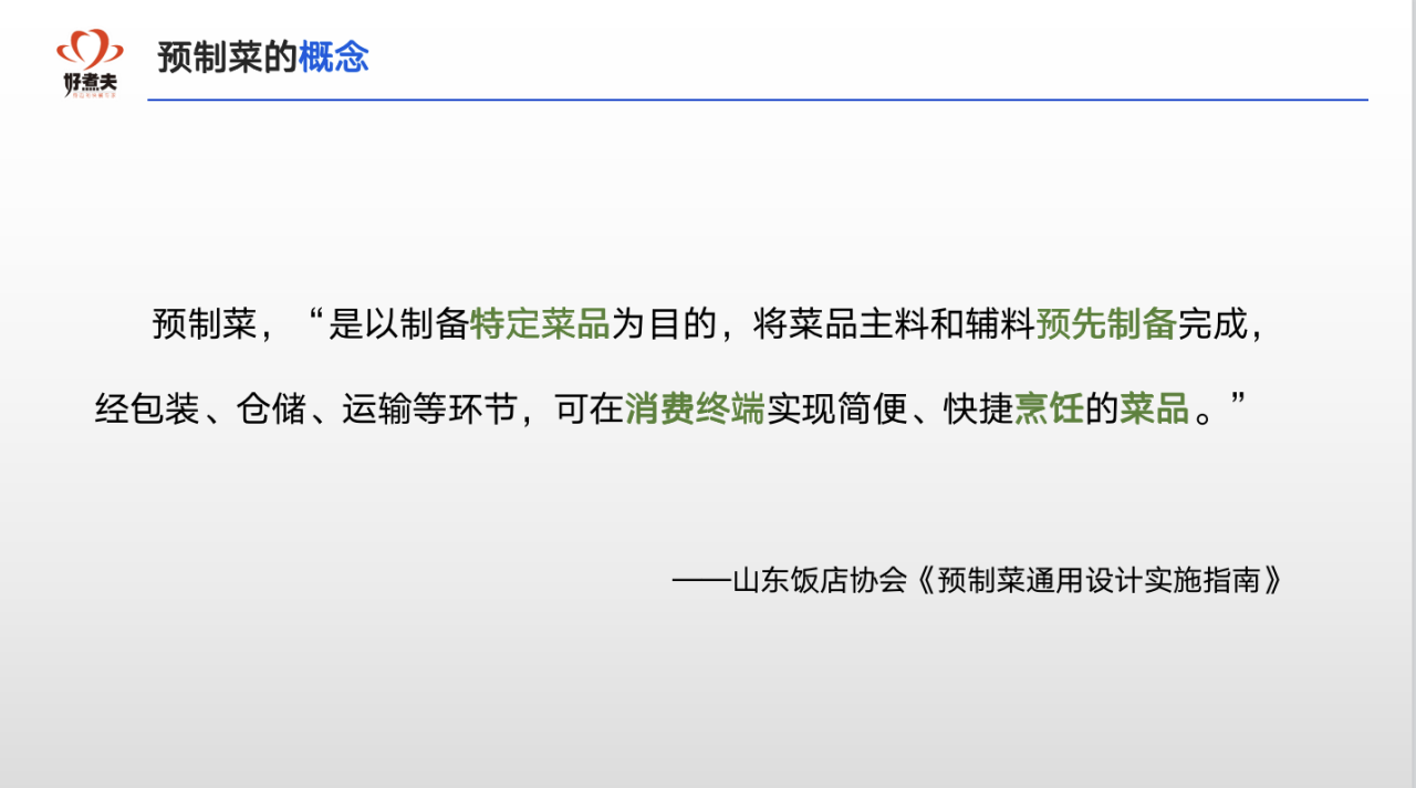 你會發(fā)現(xiàn),慢慢地預(yù)制菜這個概念把我們傳統(tǒng)的食品行業(yè)所有的產(chǎn)品都快包進(jìn)去了,如果認(rèn)為這些所有東西都叫預(yù)制菜,其實(shí)我們就相當(dāng)于是新瓶裝舊酒。在這個行業(yè)里面每個人說自己是預(yù)制菜的時候理直氣壯,但是你要說別人不是預(yù)制菜的時候就是耍流氓。現(xiàn)在急需對預(yù)制菜做一個標(biāo)準(zhǔn)出來,下圖是引用我參與過的標(biāo)準(zhǔn),就是山東餐飲協(xié)會的預(yù)制菜指南的標(biāo)準(zhǔn)。