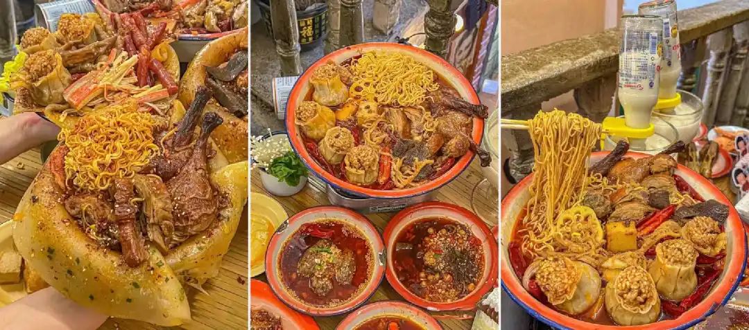 還有合肥,一家四川小吃店推出“大鐵盤冒菜”,冒烤鴨+冒手工湯包。紅油麻辣和滾燙爆汁的湯包,一口下去,就兩個字,好吃!