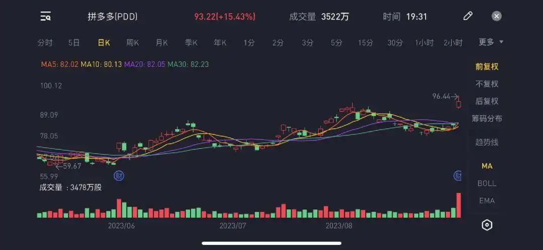 受財報利好的影響,北京時間8月29日,拼多多美股盤前大漲超10%。至北京時間8月30日美股收盤,拼多多報收93.22美元/股,大漲15.43%,總市值1239億美元。