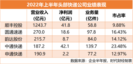 多項數(shù)據(jù)下滑,也令韻達丟掉了市占率第二的位置。上半年,中通、圓通、韻達、申通、順豐市占率分別為23.48%、16.43%、14.12%、12.97%、9.88%。其中申通擴張力度最高,市占率增長了1.88個百分點,與韻達的差距進一步縮小。