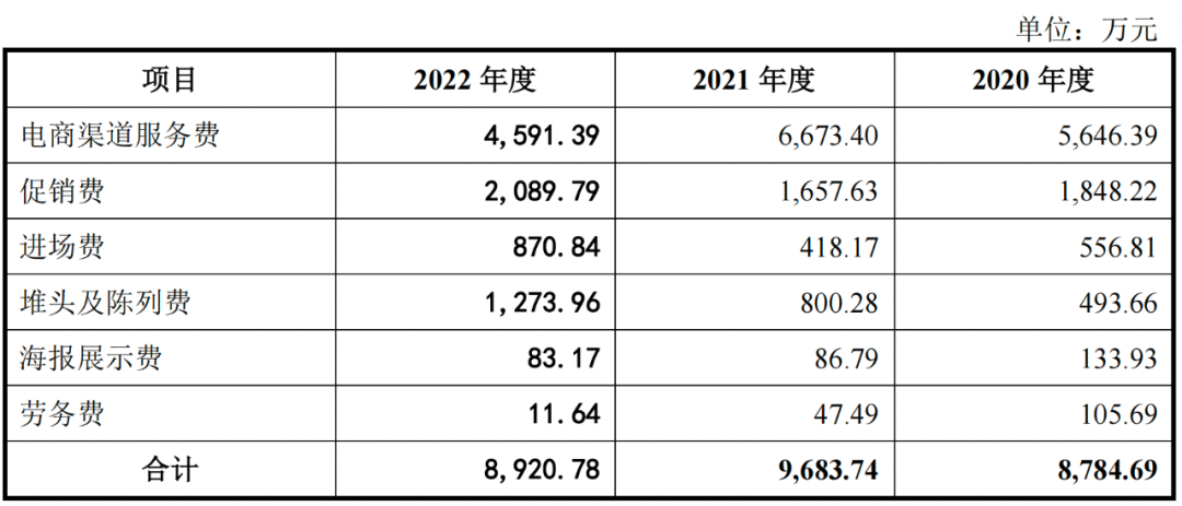 由于阿寬食品在電商平臺(tái)的投入較大,因此銷售費(fèi)用中,推廣服務(wù)費(fèi)的比例較高,報(bào)告期內(nèi)占銷售費(fèi)用的比例分別為60.81%、59%、52.73%。